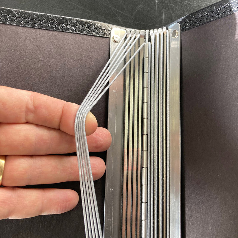 This second set of cords is grey and it overlays the first set of cords in our aluminum-hinge folders, to give 10 more lengths to use with your scores.
