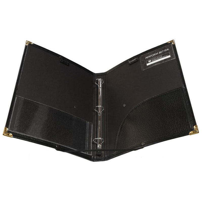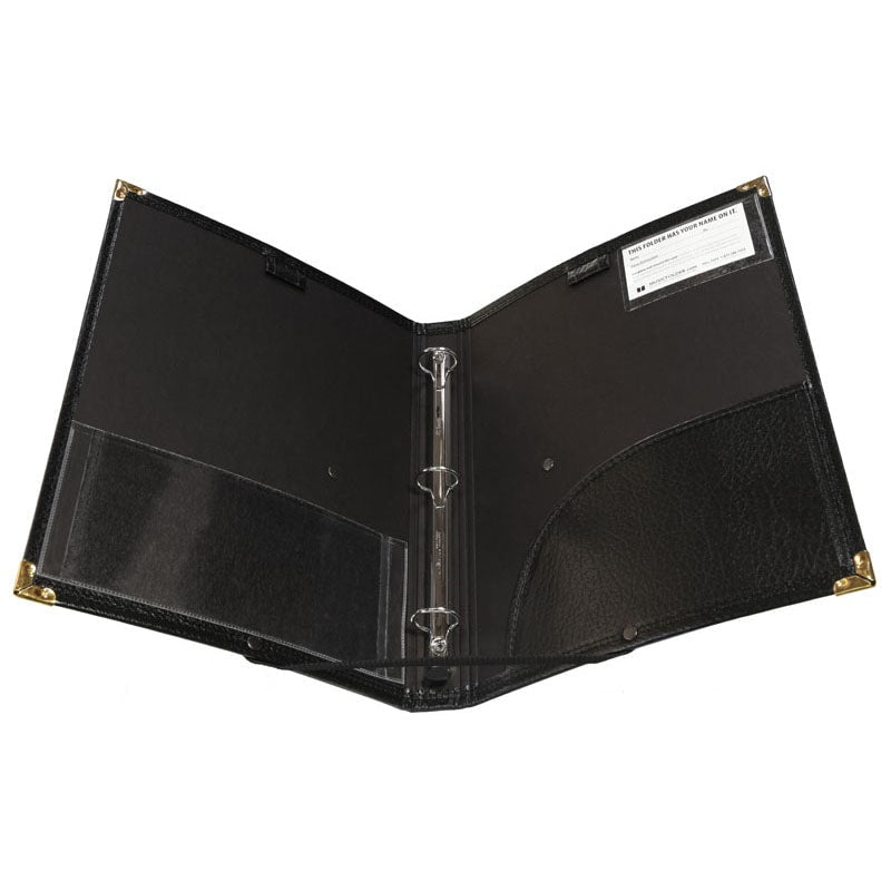 A set of 1" rings is solidly mounted within the folder, and opens with the push of a single button near the base, discreet and ergonomic. A snag-free ring interlock prevents paper from being caught during page turns, which is important during recording sessions so that your page turns aren't heard.The outside attached base strap provides more room inside the folder itself, prevents page turns from scraping, and functions as a bookmark when impromptu bows occur during concerts, so you can return immediately to your next song with no paper fumbling.