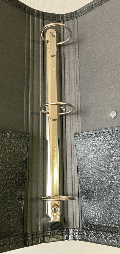 A set of oversize 1.5" rings is solidly mounted within the folder, and opens with the push of a single button near the base, discreet and ergonomic. A snag-free ring interlock prevents paper from being caught during page turns, which is important during recording sessions so that your page turns aren't heard.The outside attached base strap provides more room inside the folder itself, prevents page turns from scraping, and functions as a bookmark when impromptu bows occur during concerts, so you can return immediately to your next song with no paper fumbling.