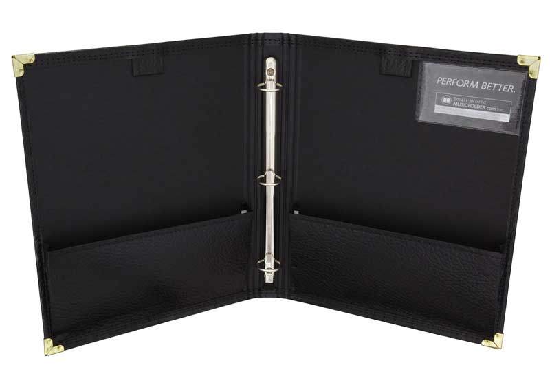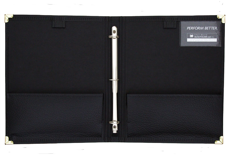 Organize it the way you're used to -- in a RingBinder. Accompanists, Directors (who never plan to use a choral hand-strap) and bands of all kinds, who mainly like to use hole-punched music, and who like two expanding 9"-wide pockets for organizing, will like this folder. The rings are solid 1" locking rings which only open by pushing the tab at the bottom. The rings join with a peg-and-hole design that cannot mis-align. The folder opens perfectly flat for use on a stand or piano. This durable folio has no breakable plastic welds in the body of the folder, as it is a one-piece design with creases to flex it around the rings.