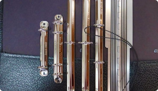 The folder has a comfortable hand strap at the back for you to hold it securely, and the deeply-textured leatherette aids in dissipating perspiration from your hand if you are performing under hot stage lights. A lightweight aluminum hinge is riveted securely inside, to give the folder superior rigidity and durability, and these folders come with a minimum of 10 lengths of elasticized cord. You can slide your opened music behind a cord, to retain it in concert order, impossible to drop, and faster to find during rehearsal. Extra cords and ring adaptors for hole-punched paper are also available.